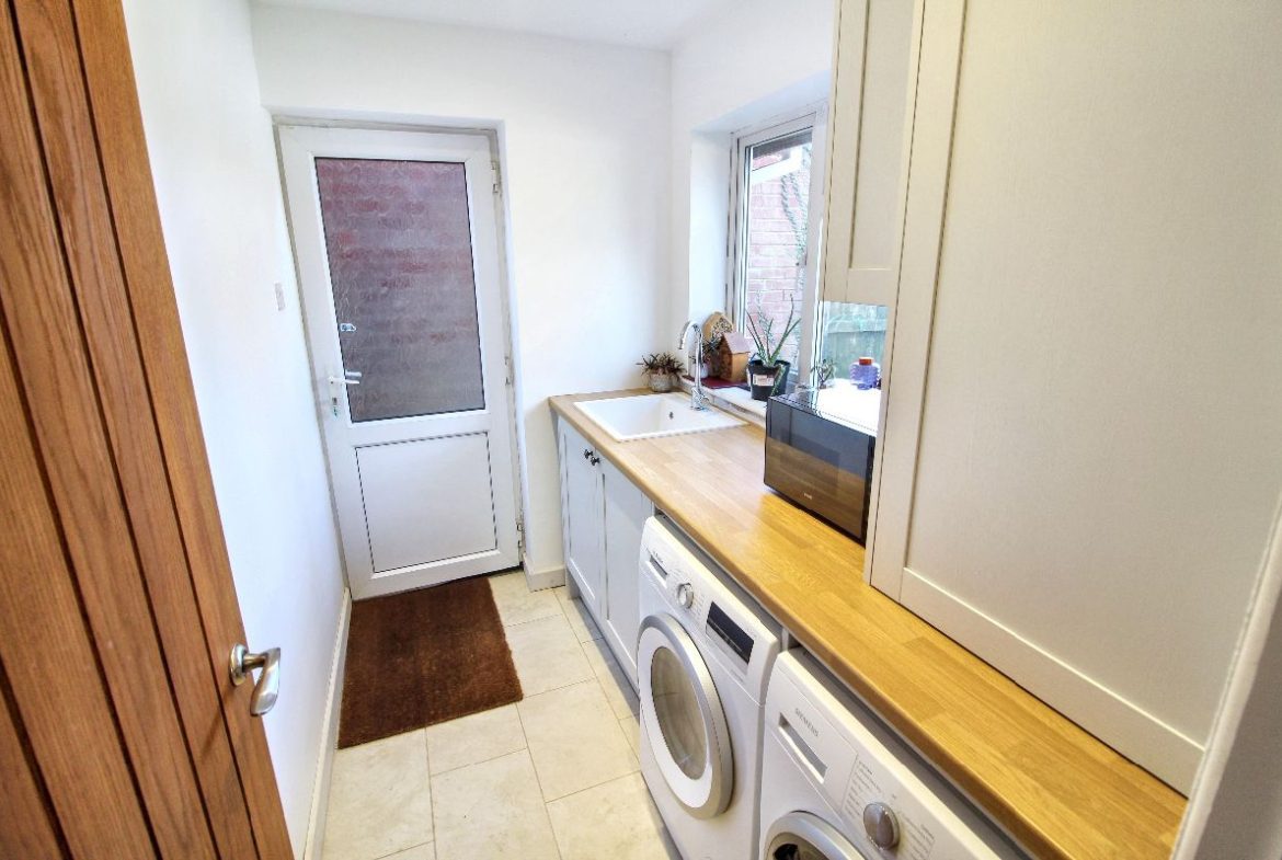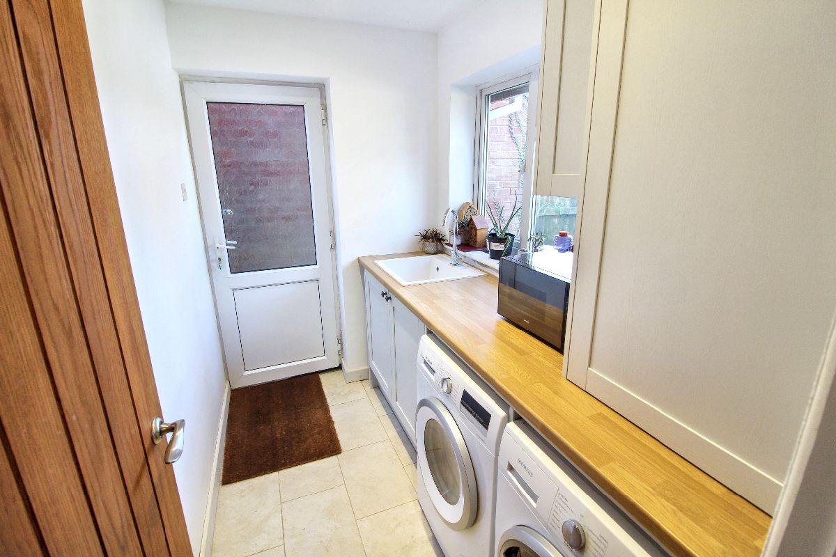 Double glazed rear facing window, wall and base units, sink and drainer with mixer tap, work-surfaces, plumbing for washing machine, space for a tumble dryer, cupboard housing boiler, UPVC side facing door to side access, spotlights to ceiling, ceramic tile flooring.