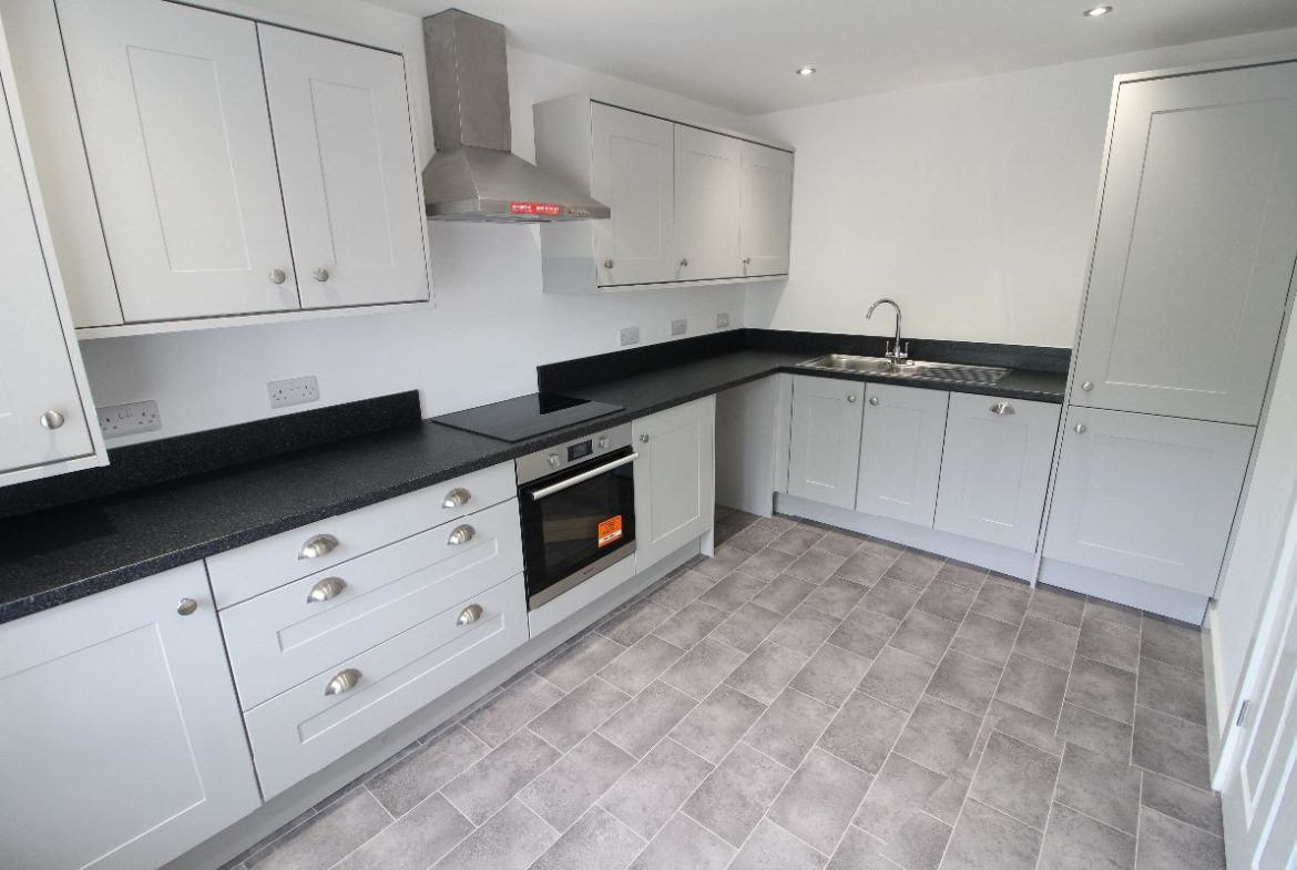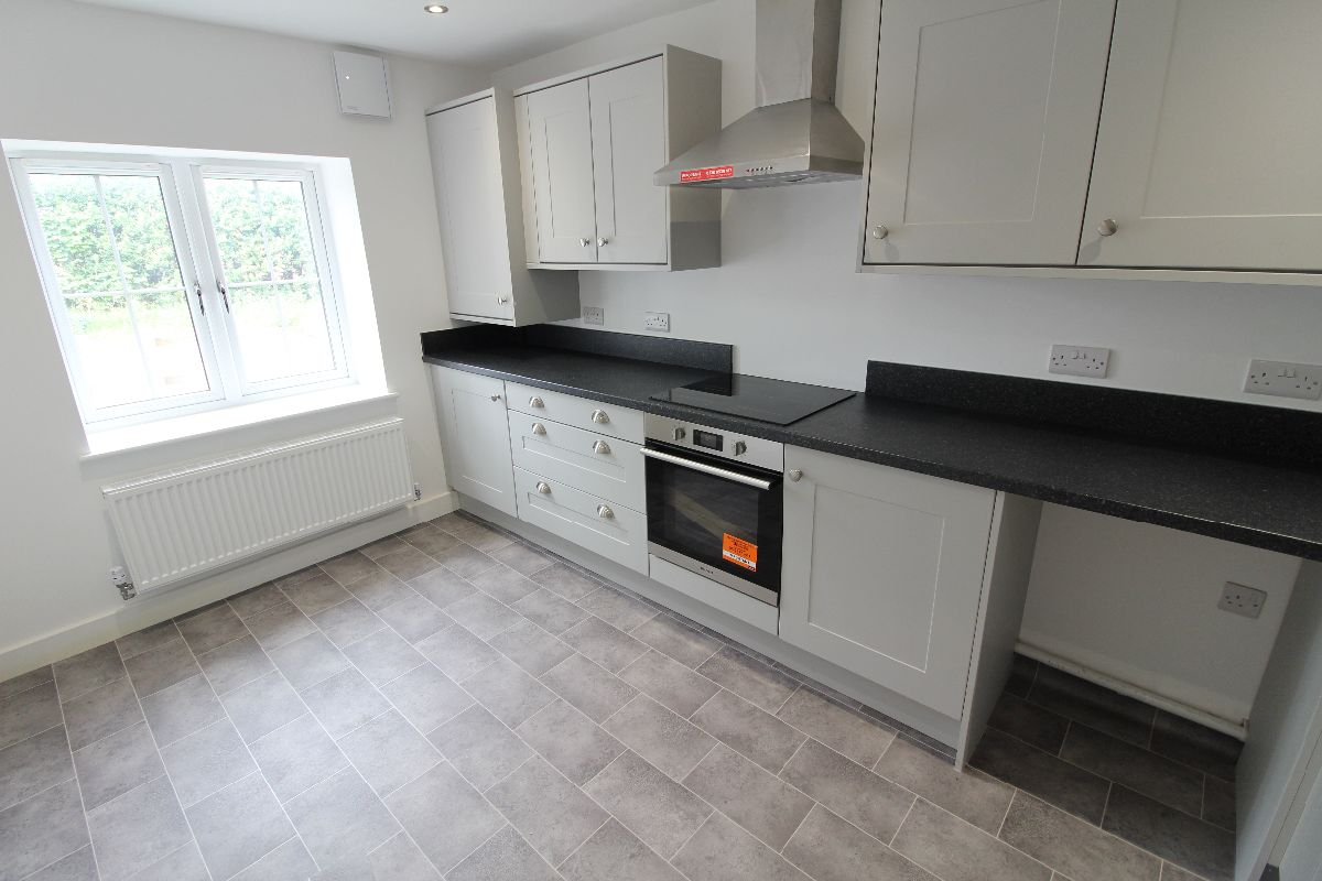 Range of wall and base units, worksurface, one and half sink and drainer with mixer tap, electric induction hob and oven with extractor over, integral fridge, freezer and dishwasher, plumbing for a washing machine, double glazed front facing window, double radiator, cupboard housing the boiler, spotlights to ceiling, vinyl flooring.