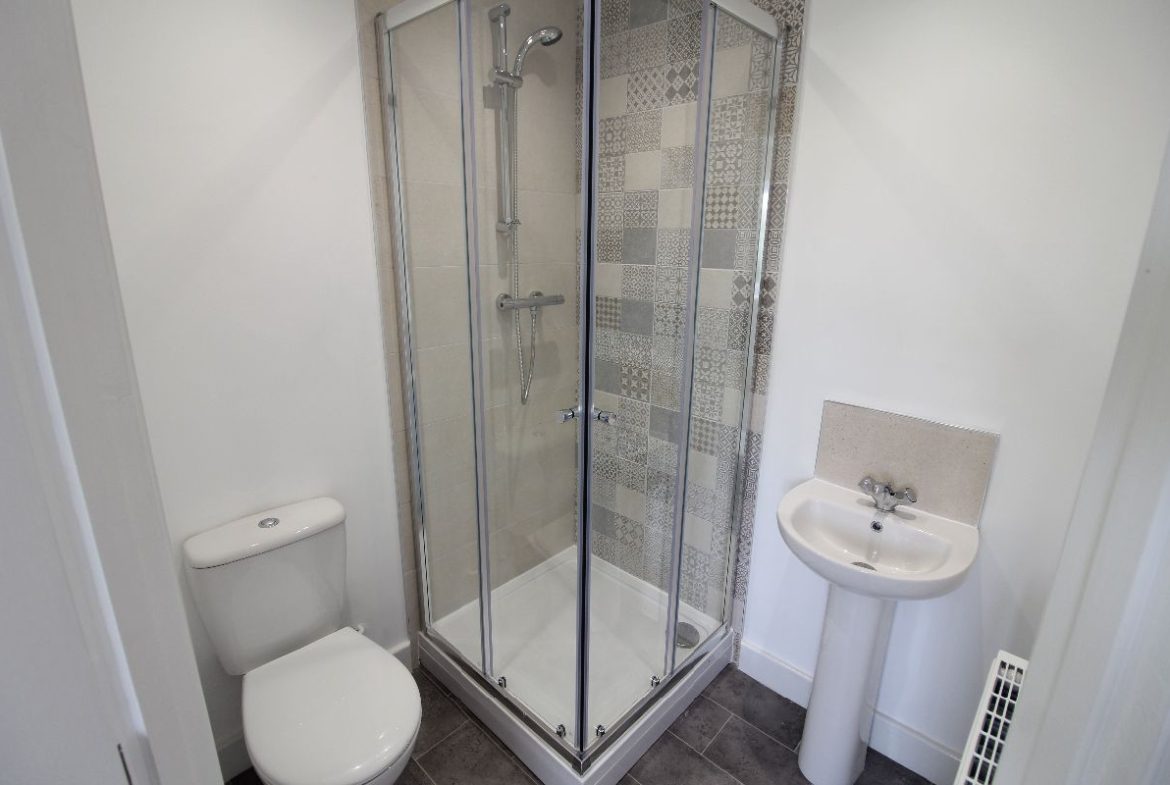 Shower cubicle and Thermostatic shower, low flush wc, sink and pedestal with mixer tap, spotlights to ceiling, extractor fan, double radiator.