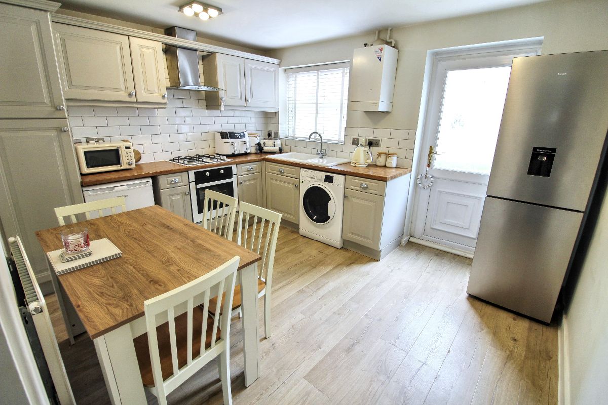 Range of wall and base units, worksurface, ceramic sink and drainer with mixer tap, gas hob, oven and extractor hob, double glazed rear facing window, wall mounted boiler, upvc door to garden, radiator, laminate effect floor.