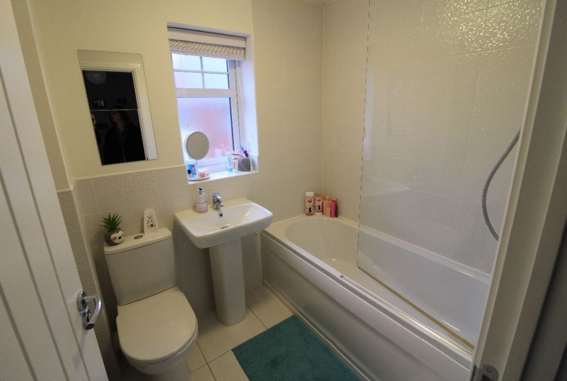 Panel enclosed double ended bath with mixer tap and thermostatic shower set, sink and pedestal with mixer tap, low flush WC, double glazed window, heated towel rack, tiles to splash area.