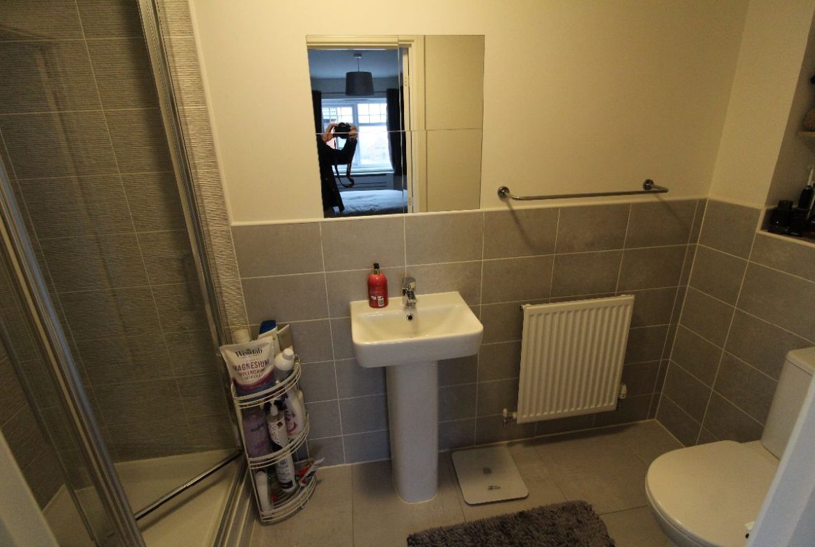 Shower cubicle with thermostatic shower set, sink and pedestal with mixer tap, low flush WC, tiles to splash area, extractor fan, radiator.