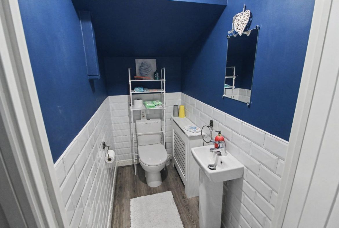 Low flush WC, sink and pedestal with mixer tap, tiles to splash area, extractor fan, double radiator.