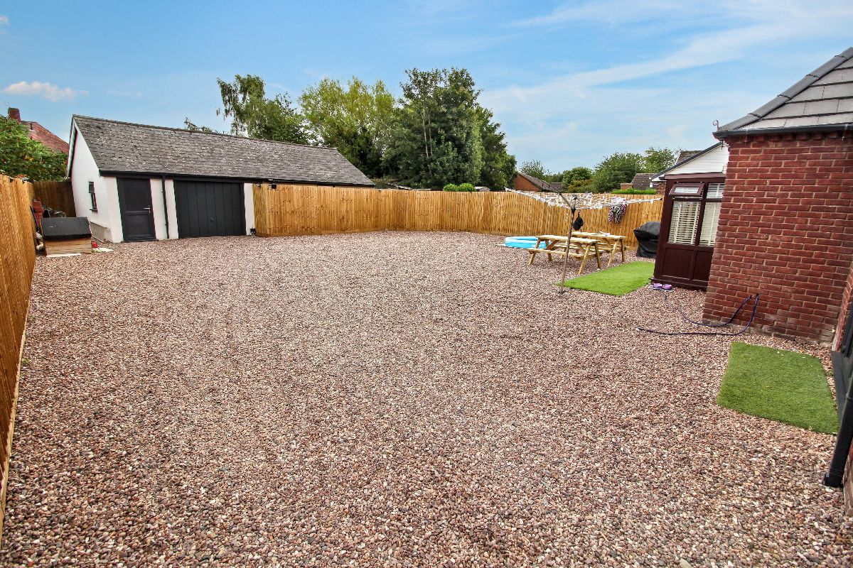 The rear of the property offers a substantial, low-maintenance gravelled garden, enclosed by new timber fencing for privacy. A detached garage and additional outbuilding provide excellent storage or potential workshop space. With plenty of room for outdoor seating, dining, and leisure, this space is perfect for families or anyone who enjoys entertaining outdoors.