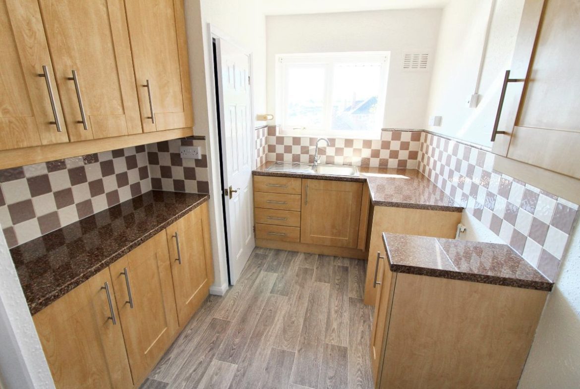 Range of wall and base units, worksurface, sink and drainer with mixer tap, double glazed rear facing window, door to cupboard housing the boiler, tiled to splash areas, plumbing for a washing machine, vinyl flooring.