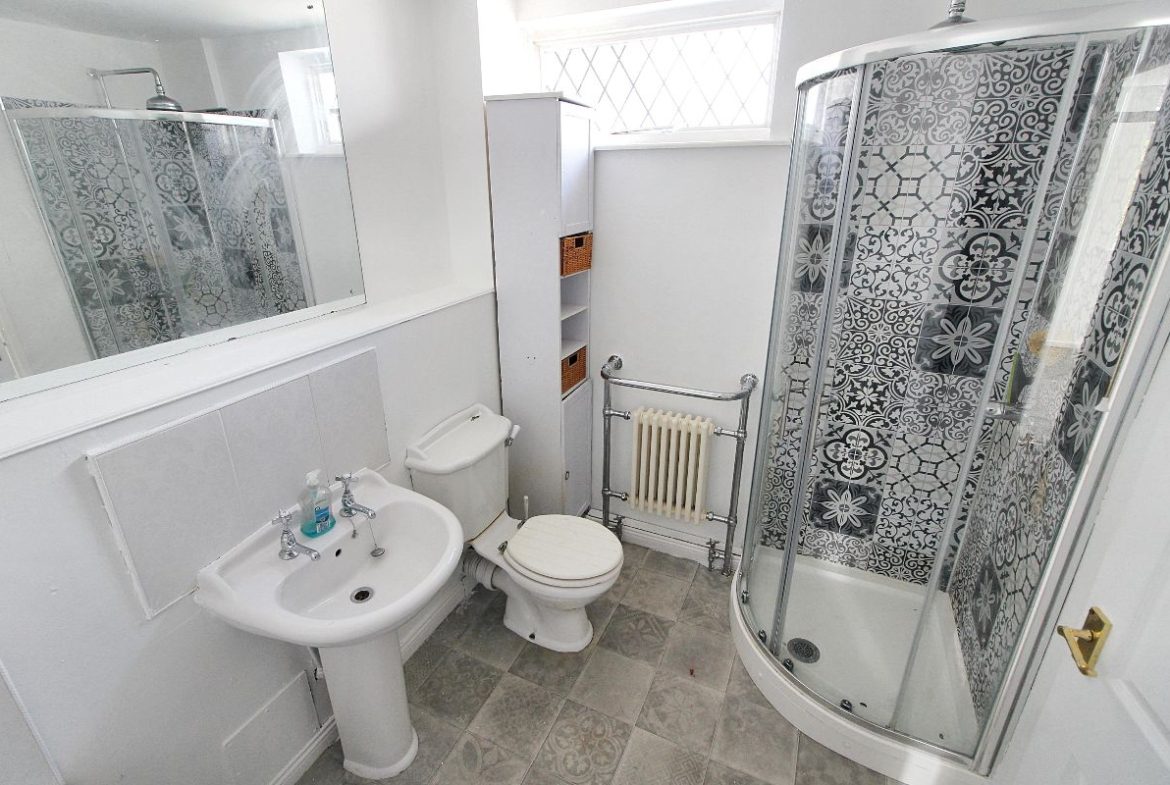 Panel enclosed bath and mixer shower set, corner shower cubicle, low flush wc, sink and pedestal, double glazed front facing window, radiator.