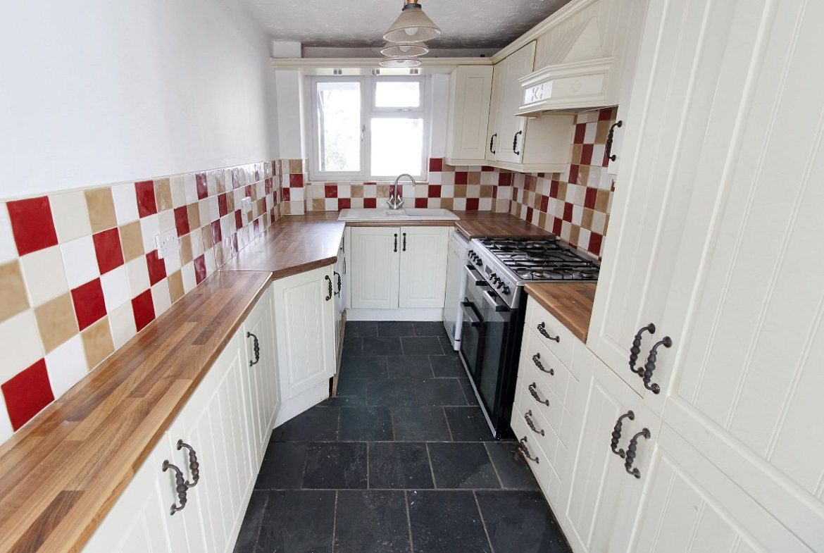 Range of wall and base units, worksurface, one and half sink and drainer with mixer tap, integral fridge, plumbing for washing machine, double glazed front facing window, ceramic tiled floor.